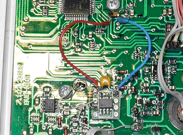 Затем надо установить плату и припаять проводники, как показано на фото снизу |